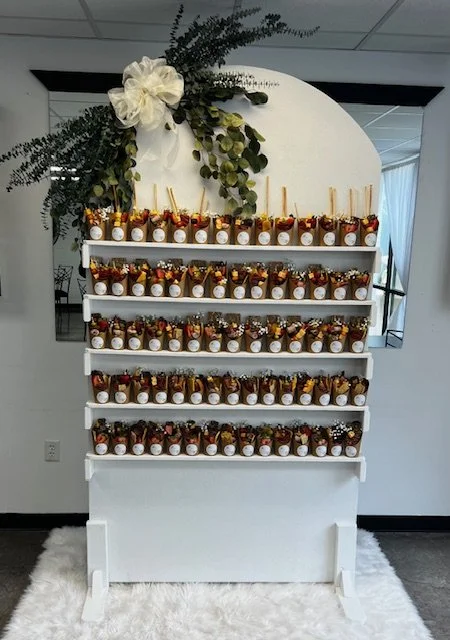 A charcuterie cups wall offers a stylish, personalized way to serve individual portions. It’s a unique and convenient display that adds elegance to any event while allowing guests to enjoy their own curated tasting experience.